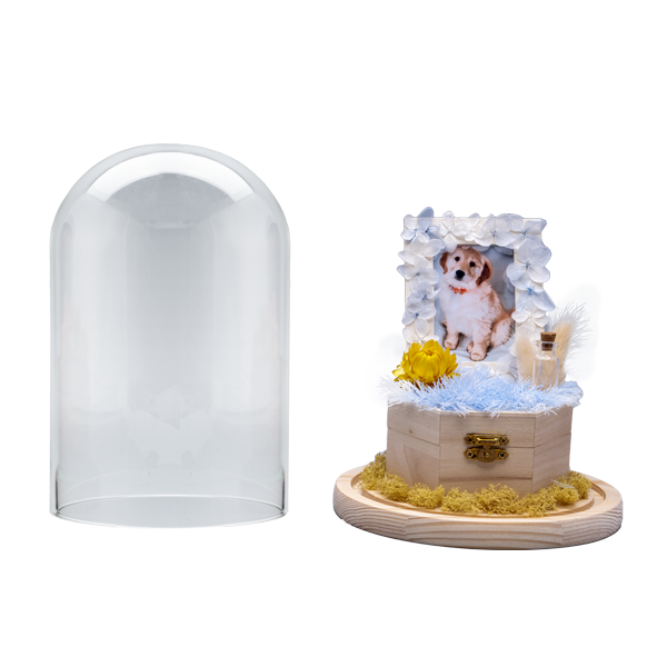 玻璃罩瓶骨灰木盒 愛寵骨灰可放置在木盒內,連同 相片存放在永生花玻璃瓶內 內有玫瑰花,乾花草,寵物照片,可自行更換; 連木座,體積約 高约24-28cm直徑约 17.5cm 由我們製作相片